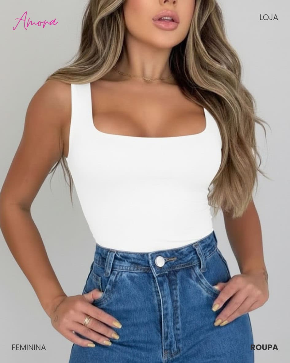 - Blusa com decote quadrado e modelagem ajustada que valoriza o corpo com elegância. Confeccionada em tecido macio e confortável, é uma peça versátil, ideal para compor desde looks casuais até produções mais sofisticadas.